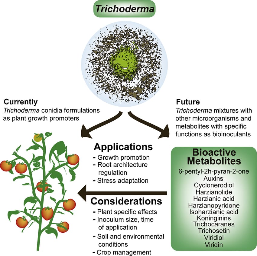 It is used for seed- and soil treatment for suppression of various diseases caused by fungal pathogens.The fungicidal activity makes T. viride useful as a biological control against plant pathogenic fungi. It has been shown to provide protection against such pathogens as Rhizoctonia, Pythium and even Armillaria. It is found naturally in soil and is effective as a seed dressing in the control of seed and soil-borne diseases including Rhizoctonia solani, Macrophomina phaseolina and Fusarium species. When it is applied at the same time as the seed, it colonizes the seed surface and kills not only the pathogens present on the cuticle, but also provides protection against soil-borne pathogens.